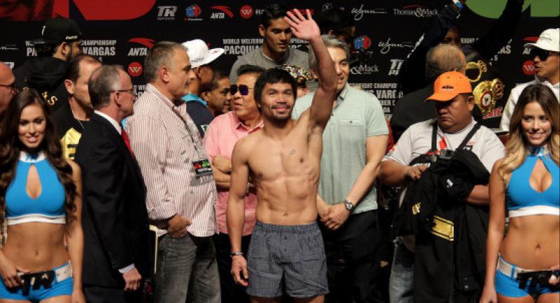 Boxers Manny Pacquiao, Philippines, and Jessie Vargas, USA, face off during their official weigh-in at the Wynn Las Vegas hotel in Las Vegas, Nevada on November 4, 2016. / AFP PHOTO