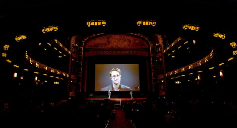 Snowden appeared Thursday via an encrypted live video stream at a cinema in Amsterdam ahead of the Dutch premiere of director Oliver Stone's new movie about his life.