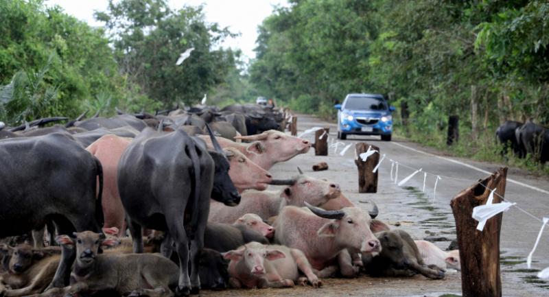 In Surat Thani’s Phunphin district, residents of Ban Thung Ao village in Tambon Sri Wichai, which has about 260 homes, yesterday moved belongings and livestock to higher ground above the one-metre-deep floodwater.