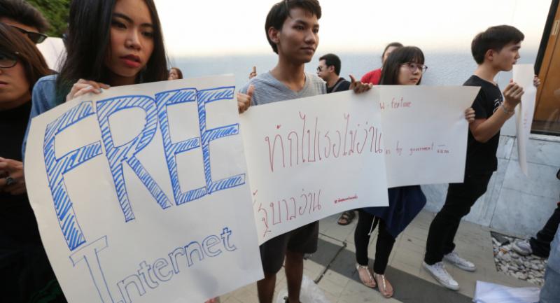 Om-thip Palanun, a first-year Chulalongkorn University student, said the law would reduce people’s freedom of expression hence the National Legislative Assembly is urged to revoke the law as demanded by about 360,000 people who signed up against the legislation. Other students also held placards that said “Free Internet”, “Invasion of privacy” and “We say No to Internet censorship”.