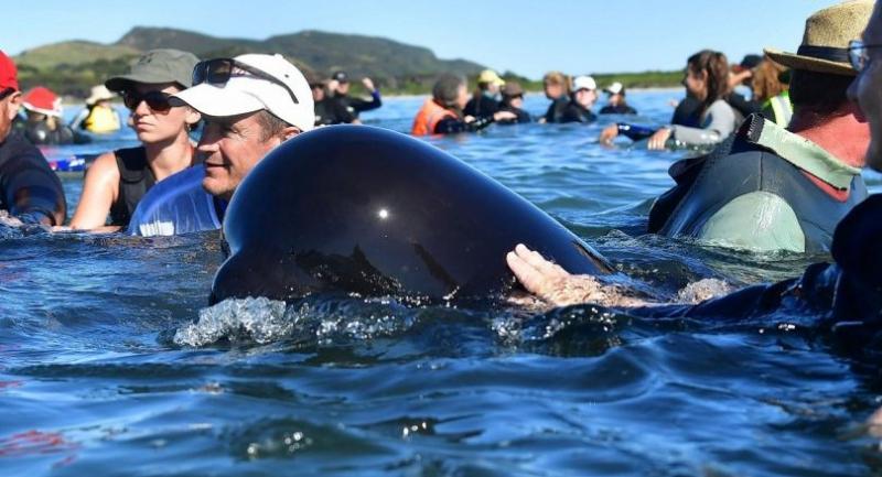 About 150 people waded out up to their necks at Farewell Spit in the northwest of the South Island to form the human wall as they also guided some 100 survivors from Friday's beaching away from the shore.