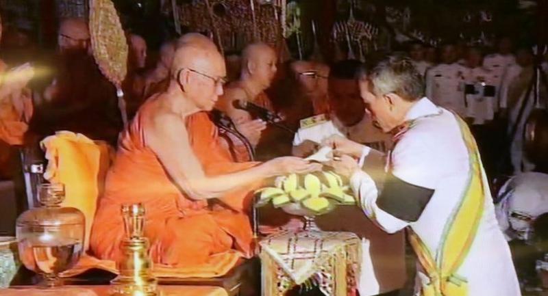 To honour Thailand’s new Buddhism chief, an investiture ceremony started at about 6.30pm with the King presenting saffron robes to senior monks from the Sangha Supreme Council. He then lit candles and incense sticks to worship the Tripitaka, after which senior monks of the Racha Khana rank chanted and granted religious precepts to the King.