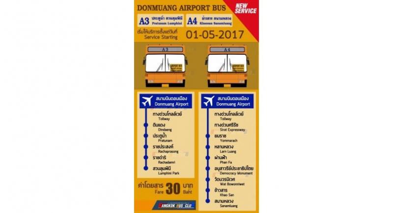 The A3 bus will run on the Don Mueang tollway to Din Daeng, Pratunam, Ratchaprasong, Rajdamri to Lumpini Park.