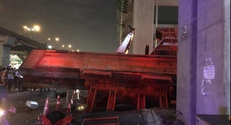 Three workers were crushed to death when a giant metal scaffold for holding concrete part of the Dark Led Line Rangsit-Bang Sue suburban railway of the State Railway of Thailand slipped on and fell on them.