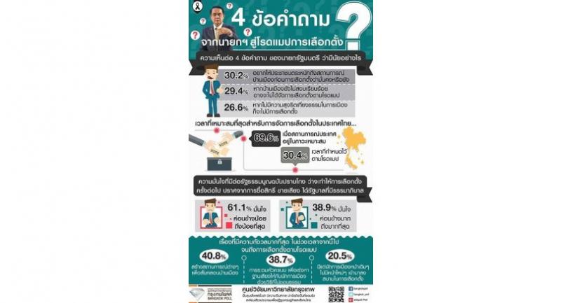 Most respondents also said they believed that Prime Minister Prayut Chan-o-cha, by posing his four political questions to voters, seemed to signal to the public that the country was stable in the run-up to the upcoming election.