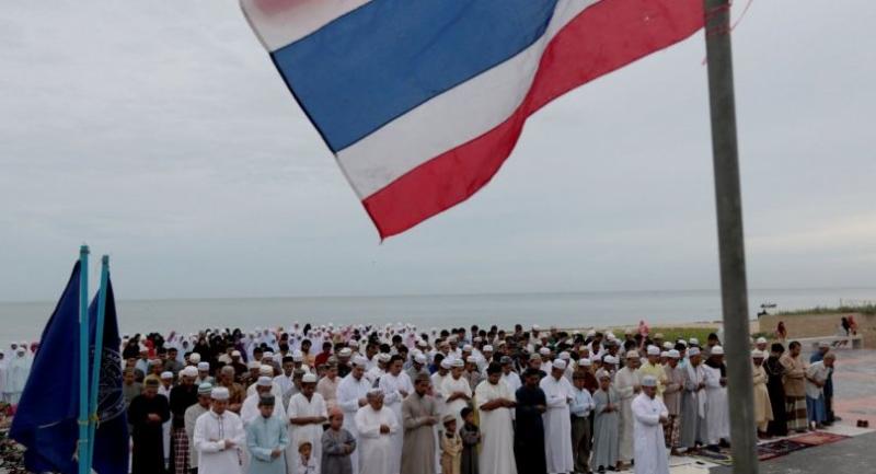 In Songkhla's Muag district, 300 Thai Muslim people perform the Eid al-Fitr prayer at a scenic seaside spot of Chalathat Beach.
