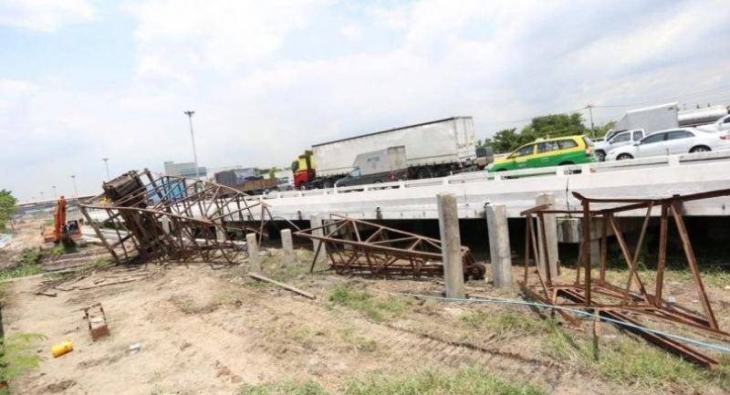 Workers told police they had been placing pillars for the bridge to extend the ring road's Thab Chang toll gate area when the crane, parked on the Khlong Jek bank, suddenly tilted and fell sideways due to ground subsidence caused by recent rain.