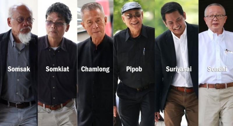The six ex-leaders are retired general Chamlong Srimuang, Somsak Kosaisuk, Pipob Thongchai, Suriyasai Katasila, Somkiat Pongpaiboon, and media mogul Sondhi Limthongkul, who is serving a jail term in a separate case involving violation of the stock market.