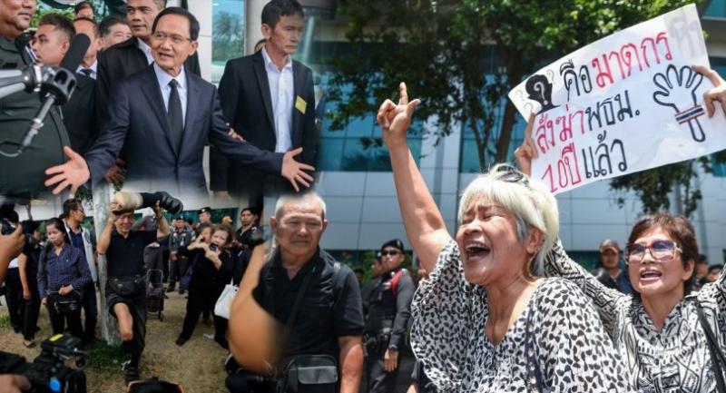 A group of people who had gathered outside the court shouted “murderer, murderer” when they spotted Somchai nearby. The ex-PM then headed back to the court building, where he was picked up by a limousine.
