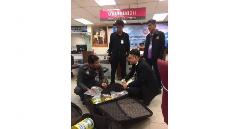 Officials questioned and searched the man at Suvarnabhumi Airport after an X-ray machine detected items suspected to be rhino horn parts in his two bags. They found the large rhino horn cut into five pieces.