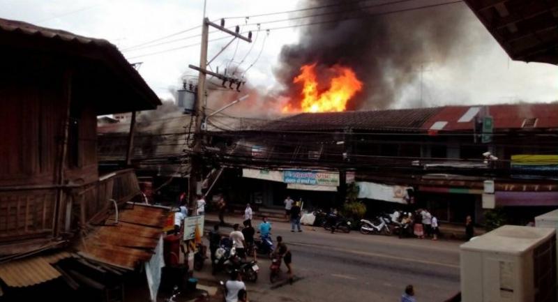 The fire started in a row of wooden shophouses in the Tha Kwian market near the entrance to Wat Tha Kwian in Tambon Phanom at 7.30am.