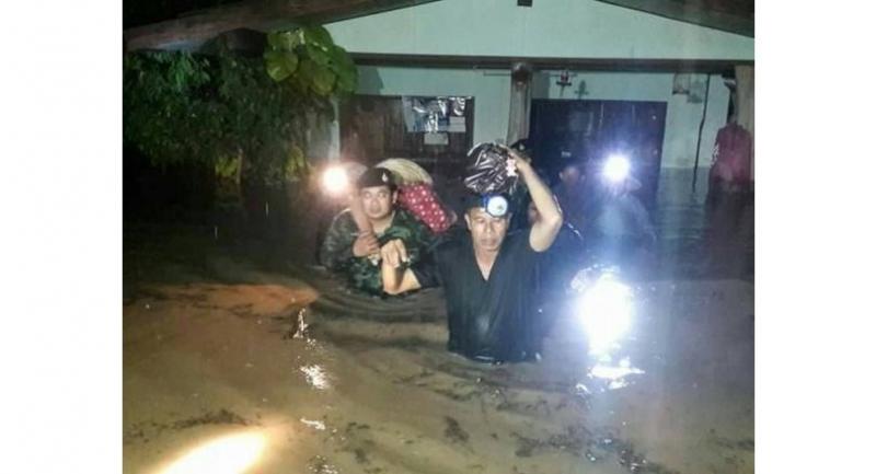 Residents in Tambon Ban Euam’s Ban Thung Kluay (Moo 5), Ban Mae Tong (Moo 6) and Ban Thung Kluay Tai (Moo 12) suddenly found themselves in waist-deep floodwater in their homes on Wednesday following the overflowing of the Mae Tam Creek. Soldiers and rescue workers helped the affected residents evacuate.