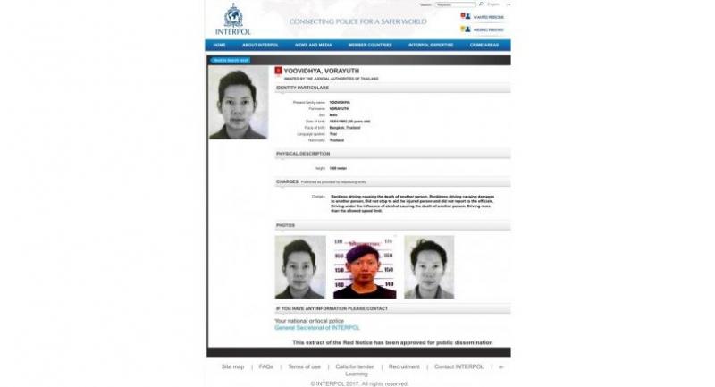 Vorayuth, who is better known as “Boss”, is listed as being wanted in Thailand on charges of reckless driving causing the death of another person, causing damage to another person, not stopping to aid an injured person and not reporting to officials.