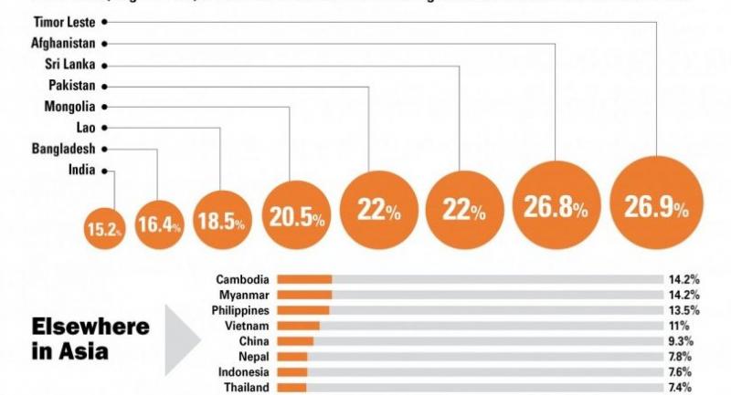 Even Vietnam, China and Indonesia have undernourishment rates of 11, 9.3 and 7.6 per cent respectively. Indonesia's undernourishment rate is almost the same as Nepal (7.8 per cent) and Thailand (7.4 per cent).