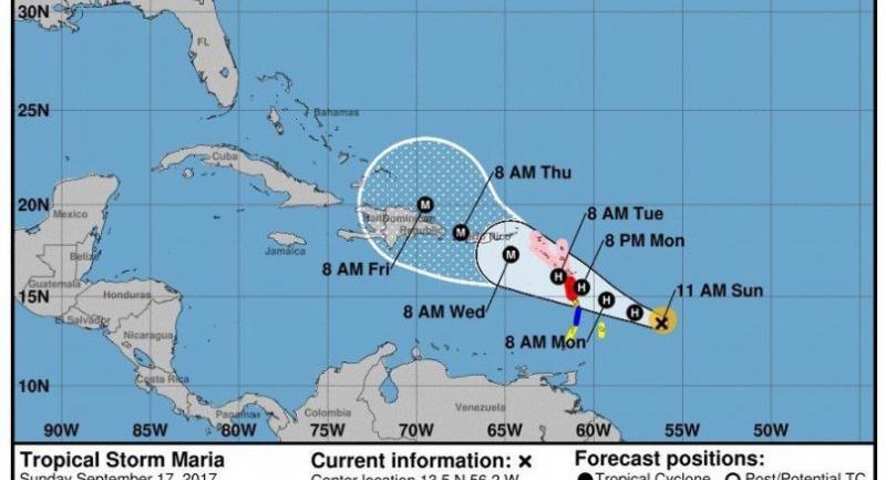"On the forecast track, the center of Maria will move across the Leeward Islands Monday night and then over the extreme northeastern Caribbean Sea on Tuesday," it said.