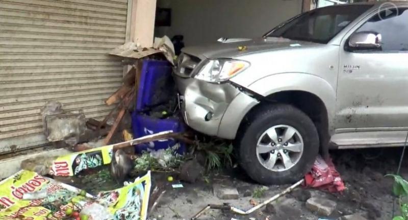 The pickup driver, Supachai Piasai, 27, said he had been driving his daughter to school when another pickup cut across his path, forcing him to swerve to the left and crash into the shop.