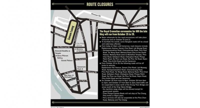 The following roads will be closed 10pm today : Rajdamnoen Avenue, Sanam Chai Road, Lak Muang Road, Kanlayanamaitree Road, Charoenkrung Road, Phra Pipit Road, Tai Wang Road, Maharaj Road (next to Grand Palace), Maharaj Road (next to Mahathat Temple), Phra Chan Road, Settakarn Road, Chetuphon Road, Phraya Petch Road, Na Phra Lan Road, Na Phra Tat Road, Rajini Road, Phra Arthit Road and Soi Saran Rom.