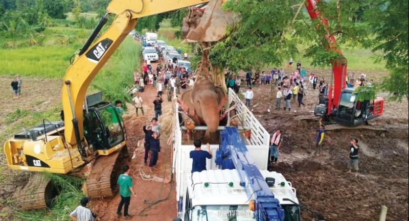 Teams of rescuers, villagers and civilians spent almost six hours moving the animal 300-metres from the bank of the Chompu canal into the truck. They were handicapped by the wet soil and the weight of the elephant as it could not stand by itself.