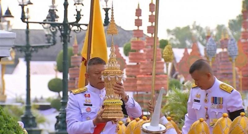 His Majesty King Maha Vajiralongkorn arrived at the Dusit Maha Prasat Throne Hall in the Grand Palace at 10.30am to preside over the religious rites. He was accompanied by members of the Royal Family including Her Royal Highness Princess Maha Chakri Sirindhorn, HRH Princess Bajrakitiyabha, and Princess Ubolratana Rajakanya.