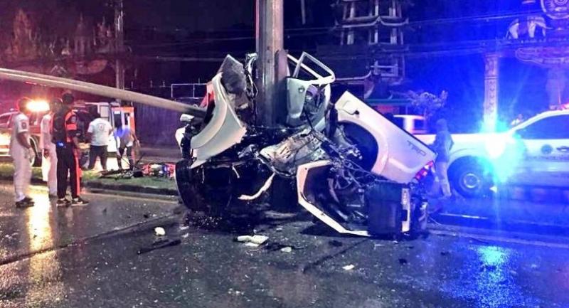 The accident occurred just after midnight this morning, at the intersection of Thepkasattri Road in front Wat Phra Nang Sang. The white pick-up truck was driven by Chatri Thongjit, 31, who died at the scene.