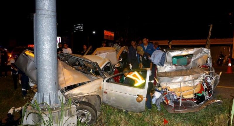 The impact of the collision sent their vehicle into a large concrete street lamp pole in the middle of the “100-body hill” in Chon Buri’s Sattahip district near Jomtien.