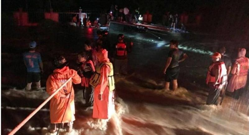 Early Wednesday, Si Chon district chief Yongyuth Jitsamruay led rescuers, police and troops to rescue passengers and the driver of the bus that was swept away by floods in front of the reception home for homeless people in Ban Khao Fai.