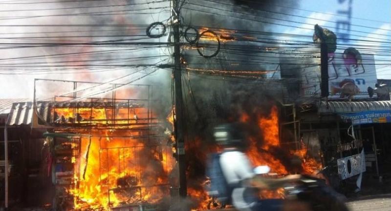 Thai News Agency reported that fire fighters rushed to the scene which is before Darasamut School near Surakul sports stadium at about 9.30am. They managed to extinguish the blaze that engulfed two shops and burn them down to the ground. No reports of injuries.