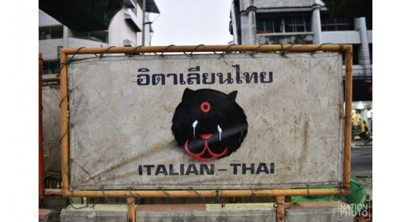 The protest artwork was spotted on Thursday afternoon at the company’s construction site at the mouth of Soi Phahonyothin 34, near the site of the company’s work building Sena Nikom Station in the northern expansion of the BTS Skytrain Green Line.