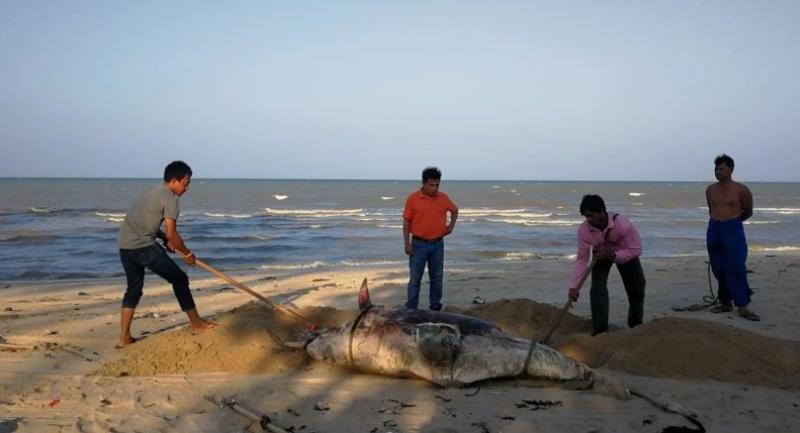 After local officials alerted the Chaiya fishery authority and the Gulf of Thailand’s Marine and Coastal Resource Research and Development staff in Chumphon, officials came to inspect the carcass, took detailed photographs of it and had the buried the carcass by Friday afternoon.