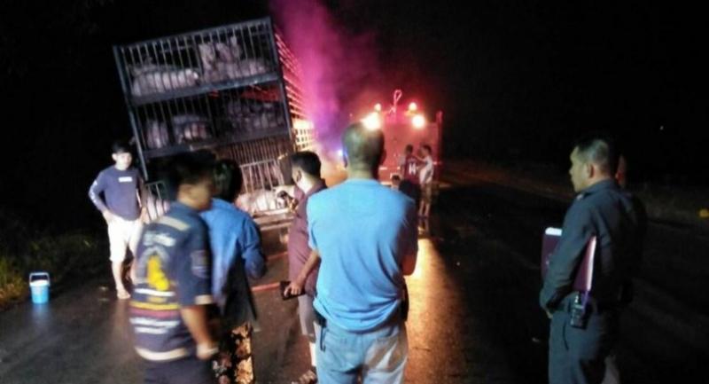 Somporn said he took the pigs from a farm at 3am, heading to a slaughterhouse in Sa Kaew. He said one of his truck’s rear tyres caught fire, apparently because of a malfunctioning brake system.