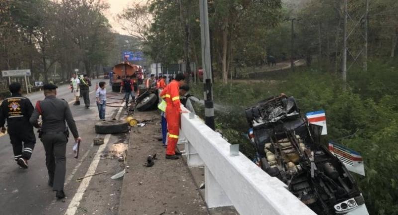 Police said the bus crashed into a rail on the Pha Nok Khao bridge linking Khon Kaen’s Chomphu district and Loei’s Phu Kradung district at 6.30am and fell down to a dry creek below.