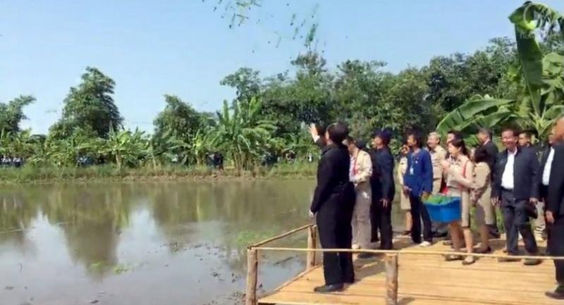 While the premier was throwing the rice saplings into the field in front of him, Grisada accidentally threw some close to Prayut and they landed on his head, prompting smiles and laughter among the group.