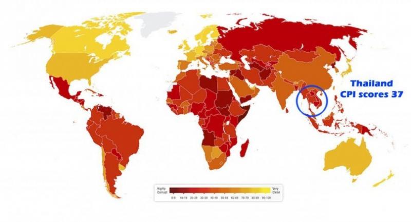 On a scale of 0 to 100, in which 0 is “highly corrupt” and 100 is “very clean”, Thailand scored 37 this year, up from 35 last year.