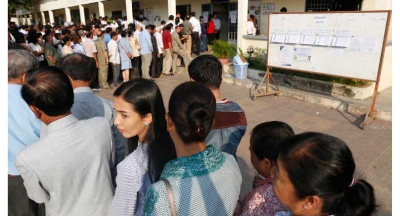 Early in the day, enthusiastic electors lined up outside polling booths at Phnom Penh’s Bun Rany Hun Sen High School near Wat Phnom to cast their ballot for one of the four parties contesting the elections.