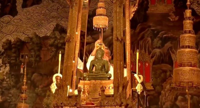 His Majesty the King presides over a ceremony to change the gold seasonal costume of the Emerald Buddha at Wat Phra Kaew (Temple of the Emerald Buddha), which is known officially as Wat Phra Si Rattana Satsadaram, on Friday evening.