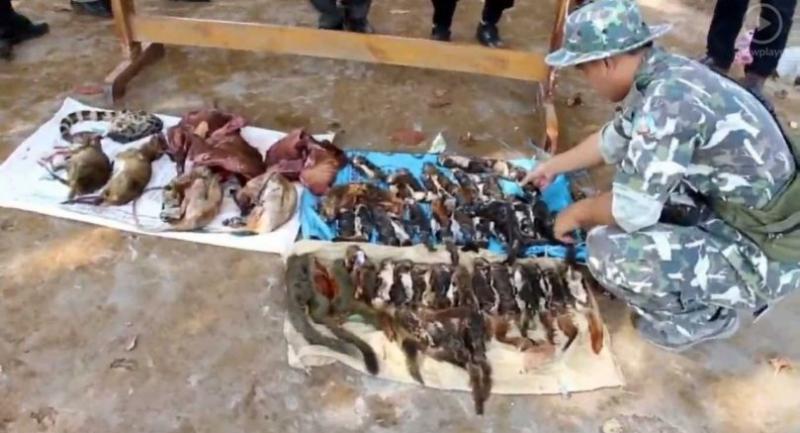They suspect that the six sacks containing the bodies of eight shrew-faced ground squirrels, 59 smoky flying squirrels, one barking deer, five mouse deers, three red giant flying squirrels, one spotted giant flying squirrel, and three civets were smuggled across the Mekong River into Thailand for sale.