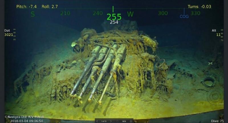 The search team also released pictures and video of parts of the ship, including a nameplate, and anti-aircraft guns covered in decades of slime.