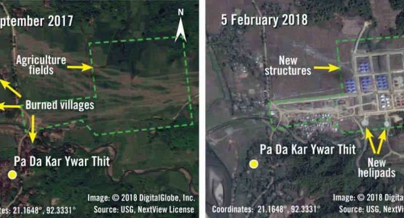 Though admitting the images only paint a partial picture, the rights group says structures for security forces, helipads and even roads have been built in and around torched Rohingya properties.