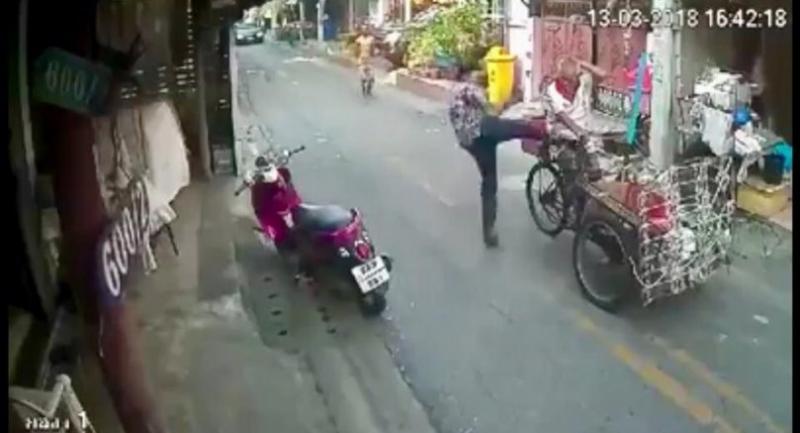 The footage showed Jaroon pause to look at the motorcyclist briefly before pedalling on. The motorcyclist is then seen running after Jaroon, who paused again, and then kicking him in the chest and punching him, sending the elderly man to the ground.