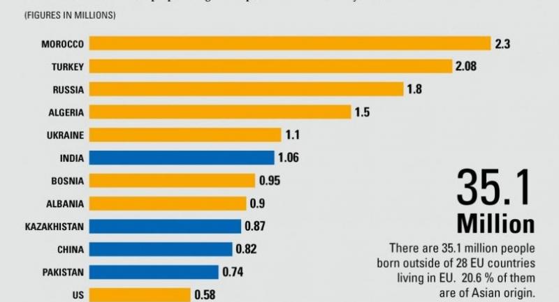 People from Morocco and Turkish origin are the largest among the foreign born population in Europe. While Turkish born people number 2.08 million, Moroccan origin people form the largest pool of foreign born Europeans at 2.3 million.