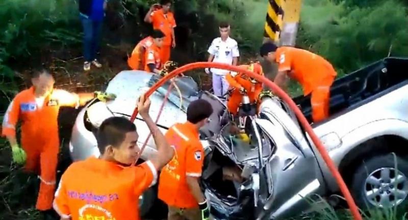 Police said Oon Priewkrathok, 61, and Suwat Priewkrathok, 40, were in the front seats of the pickup truck when it hit the power pole on the Chokchai-Ratchasima road in Chokchai district at 5.10am.