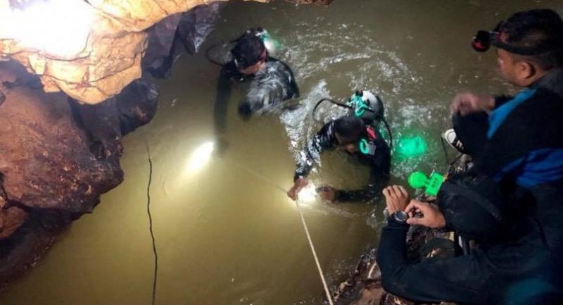 Facebook user Thai Navy Seal posted a series of photos, showing two divers in the water in the cave, carrying cables.