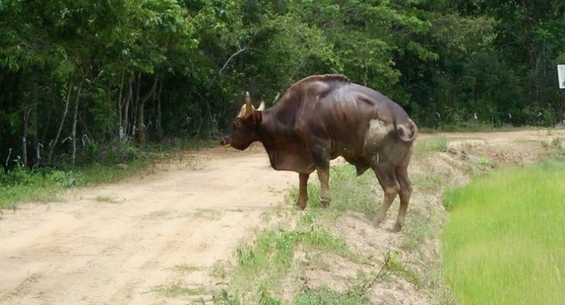 Ta Phraya National Park officials are observing the young male gaur at the edge of forest near Ban Khao Wong village in Tambon Thap Rat after villagers alerted them to the injured animal on Thursday night.