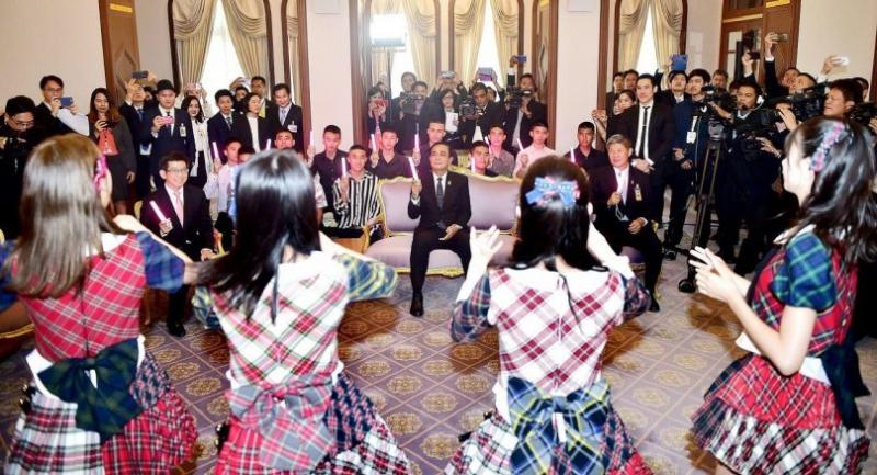 Many fans waited to greet their idols and the whole meet-up was broadcast live on the government’s Facebook page. In the broadcast, General Prayut was seen waving his light stick in time as six members of the AKB48 members – Nanami Asai, Chiba Erii, Iwatate Saho, Mogi Shinobu, Nakanishi Chiyori and Sasaki Yukari – performed their famous single “Koi Suru Fortune Cookies”. Later the PM shook the girls’ hands and took a selfie with them.