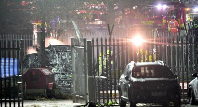 This screen grab taken from handout video posted on the Twitter account of @LEO_BRUKA on October 27, 2018 shows flames coming from the wreckage of a helicopter that crashed in a car park outside Leicester City Football Club's King Power Stadium in Leicester.// AFP PHOTO