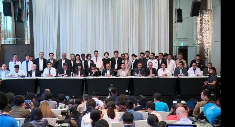 Represented at a press conference where the coalition was proposed were Pheu Thai, Future Forward, Seri Ruam Thai, Puea Chat, Prachchat and Phalang Puangchon Thai.
