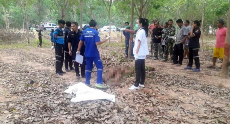 Following the discovery of a dead body at 6am in a rubber plantation near the entrance of Ban Sub Khaning village in Noen Din Daeng district, the police investigator Pol Lt-Colonel Waiphot Suchakhreekul along with rescue workers and a medical examiner went to inspect the scene.