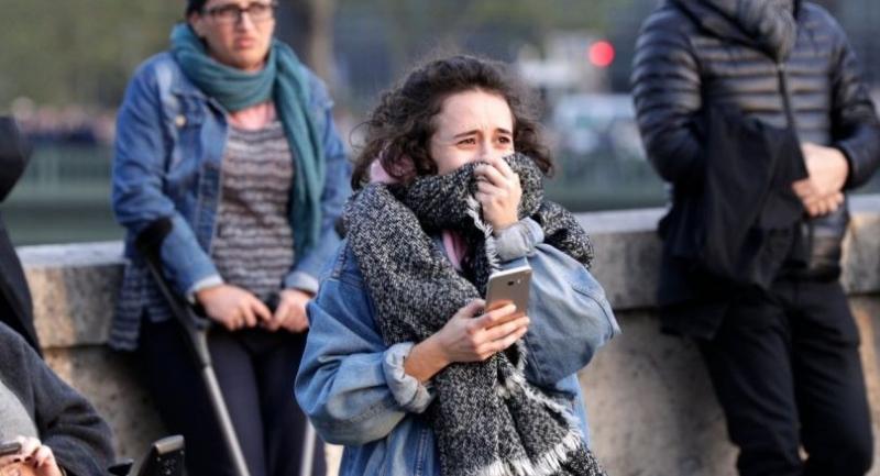 People react as they watch flames engulf the roof of the Notre-Dame de Paris Cathedral in the French capital Paris on April 15, 2019. /AFP