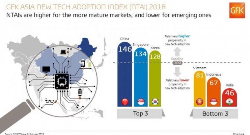 GfK reported a wide ranging spectrum of NTAI between 46 and 146 for the nine Asian markets, highlighting the vast differing levels of new technology adoption in the region. While showcasing the rise of key markets in new tech adoption, it also reveals the fact that the region is home to some of the laggards in this area. The top three markets with the highest overall NTAIs are China (146), Singapore (134) and South Korea (128), while India (46) and Indonesia (67) took their positions at the opposite end of the scale.
