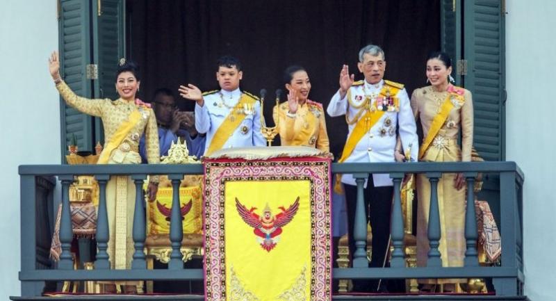 The monarch appeared on the balcony on the second floor of the Suddhaisavarya Prasad Hall at about 5pm yesterday with HM Queen Suthida at his side. Standing behind them were his children, their Royal Highnesses Princess Bajrakitiyabha, Princess Sirivannavari Nariratana and Prince Dipangkorn Rasmijoti.